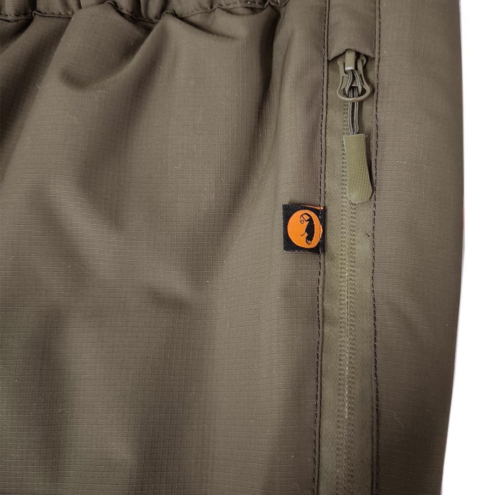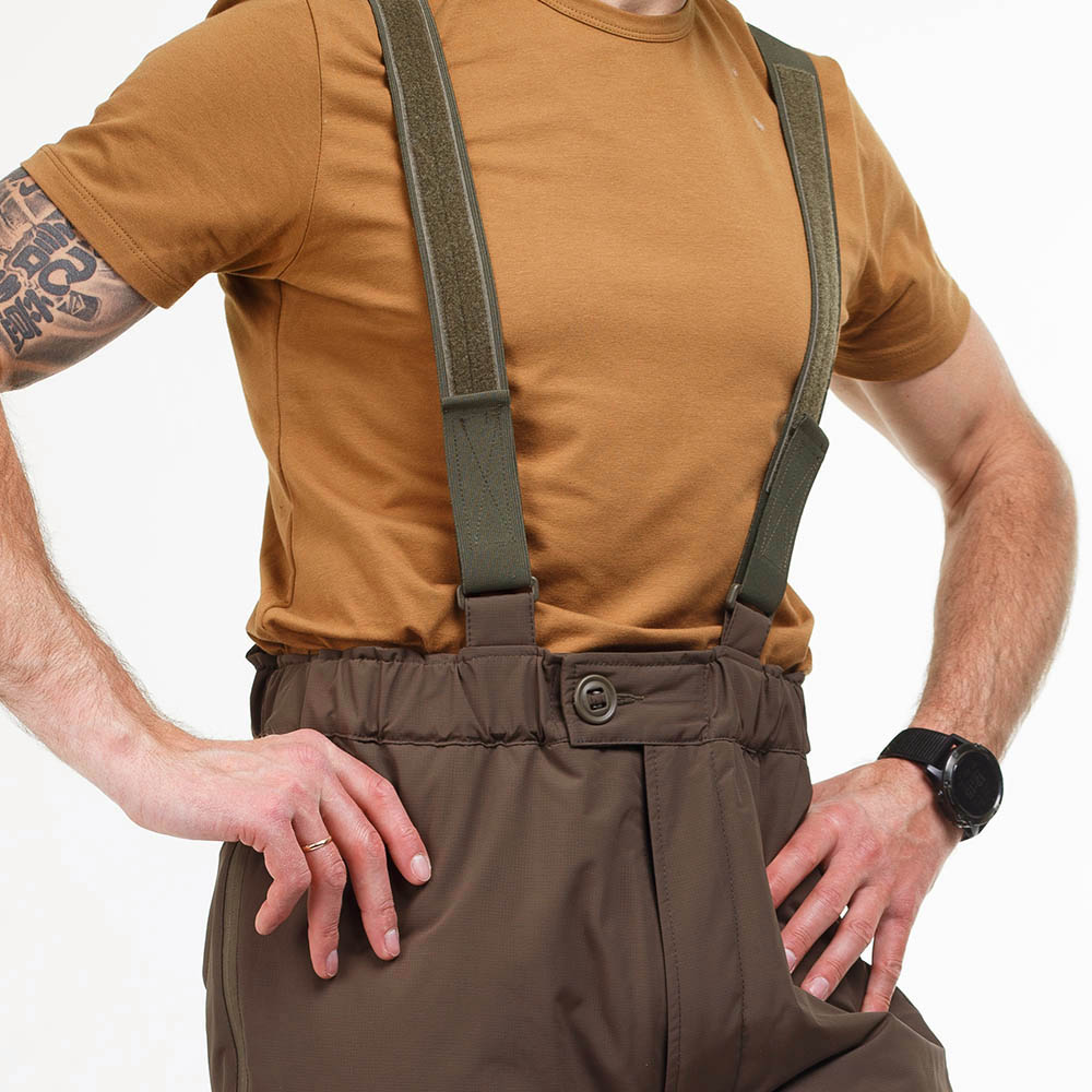 Верх штанів виготовлений із міцної, вологостійкої плащової мембранної тканини 100% NYLON 6.6 FD Cordura ripstop PU Milky Lamination (100% нейлон) щільністю 195 г/м2. Тканина зносостійка, міцна, стійка до стирання та розривів. Завдяки внутрішньому мембранному покриттю куртка має відмінну водонепроникність та гігроскопічність, відповідає ISO811 ≥ 10000 мм Н2О. Така тканина також перешкоджає проникненню вітру, що не продувається. Завдяки цій властивості знижуються втрати тепла з-під одягу, і частково створюється бар'єр зовнішнього високотемпературного впливу. Мембрана виводить зайве тепло та вологу назовні, підтримуючи мікроклімат усередині одягу, забезпечуючи додатковий комфорт. Підкладкова тканина 100% нейлон щільністю 36 г/м2.
