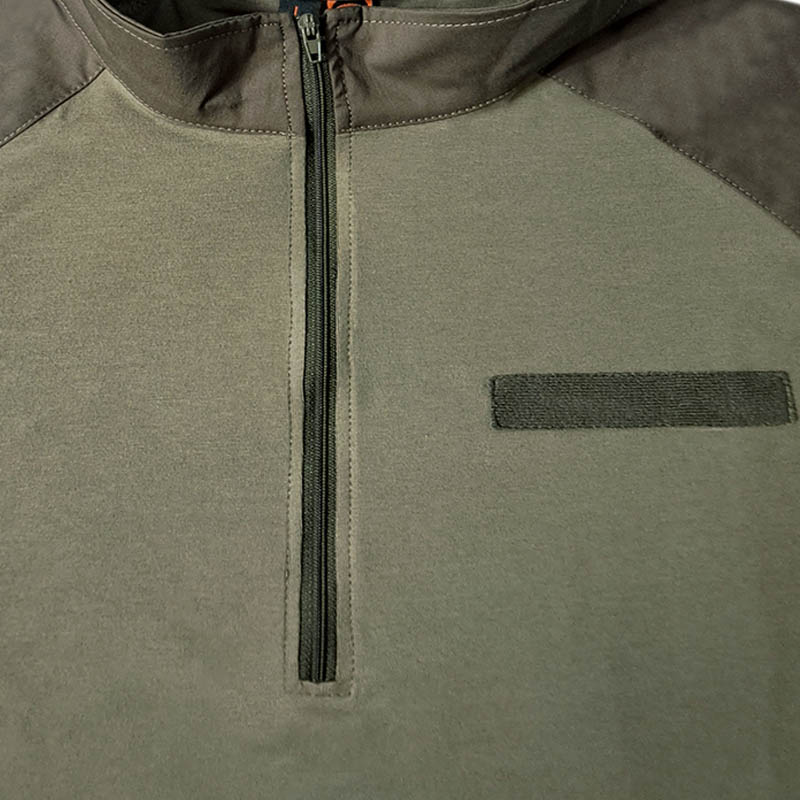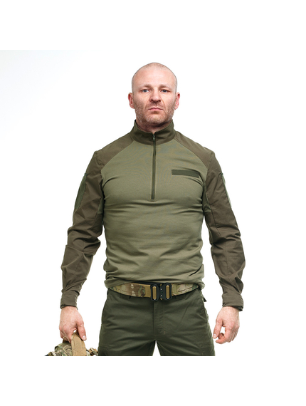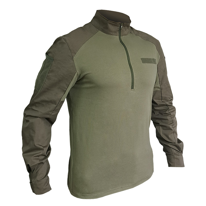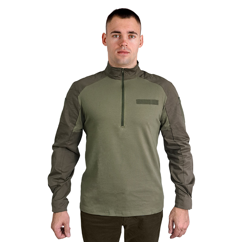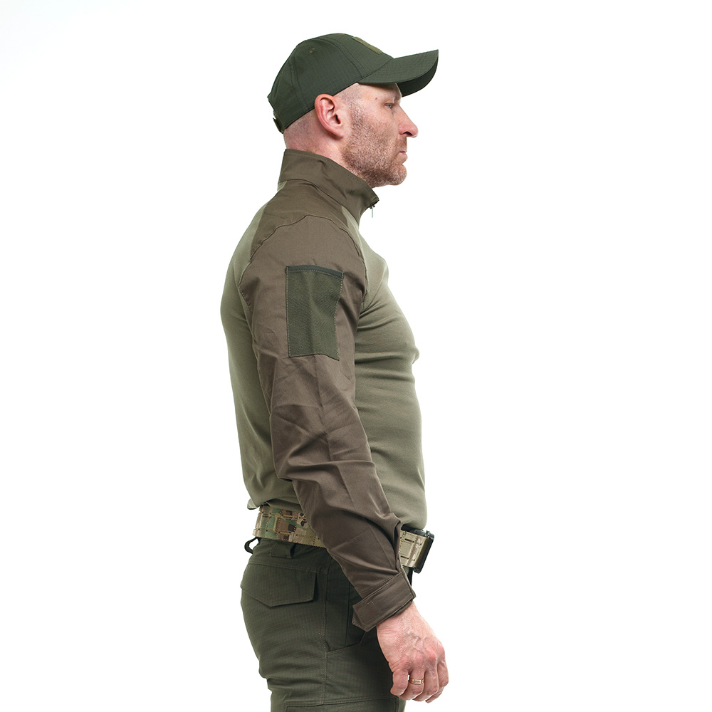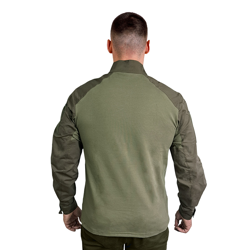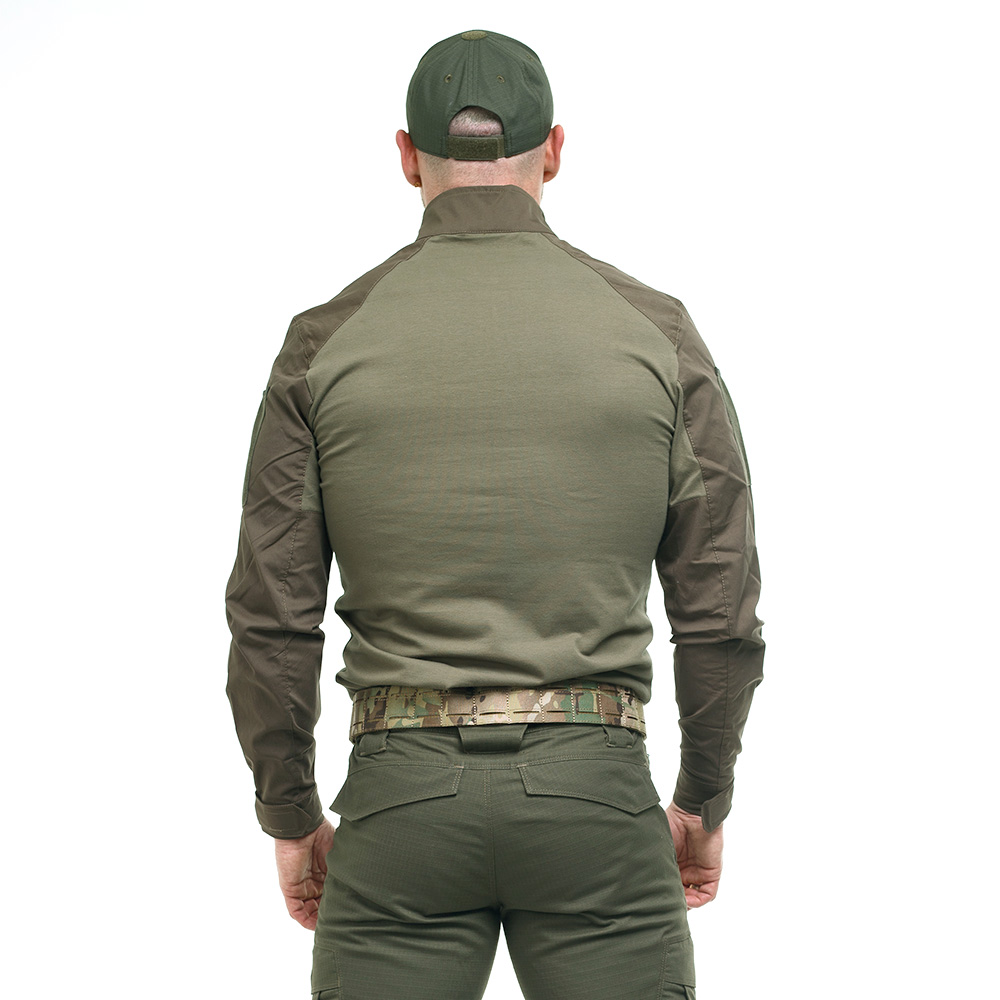 Комір сорочки стійка, щоб шия не натиралася розвантажувальною системою або бронежилетом. Застібається сорочка на коротку блискавку під горлянку.
