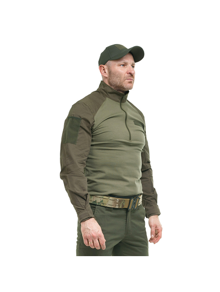 Тактична сорочка Alpha Summer Flex Olive термофутболка з довгим рукавом виготовлена з комбінованих тканин. Tактична сорочка створена на основі військових кітелів спеціально для носіння разом із бронежилетом або розвантажувальною системою у вигляді жилета, а тому на грудях та спині не мають виступаючих частин чи кишень. Тому область грудей, живота і спини виконана з приємного до тіла, м'якого, легкого дихаючого матеріалу (95% бавовни та 5% еластану), який добре пропускає повітря і не дає ковзати надіти поверх бронежилету.