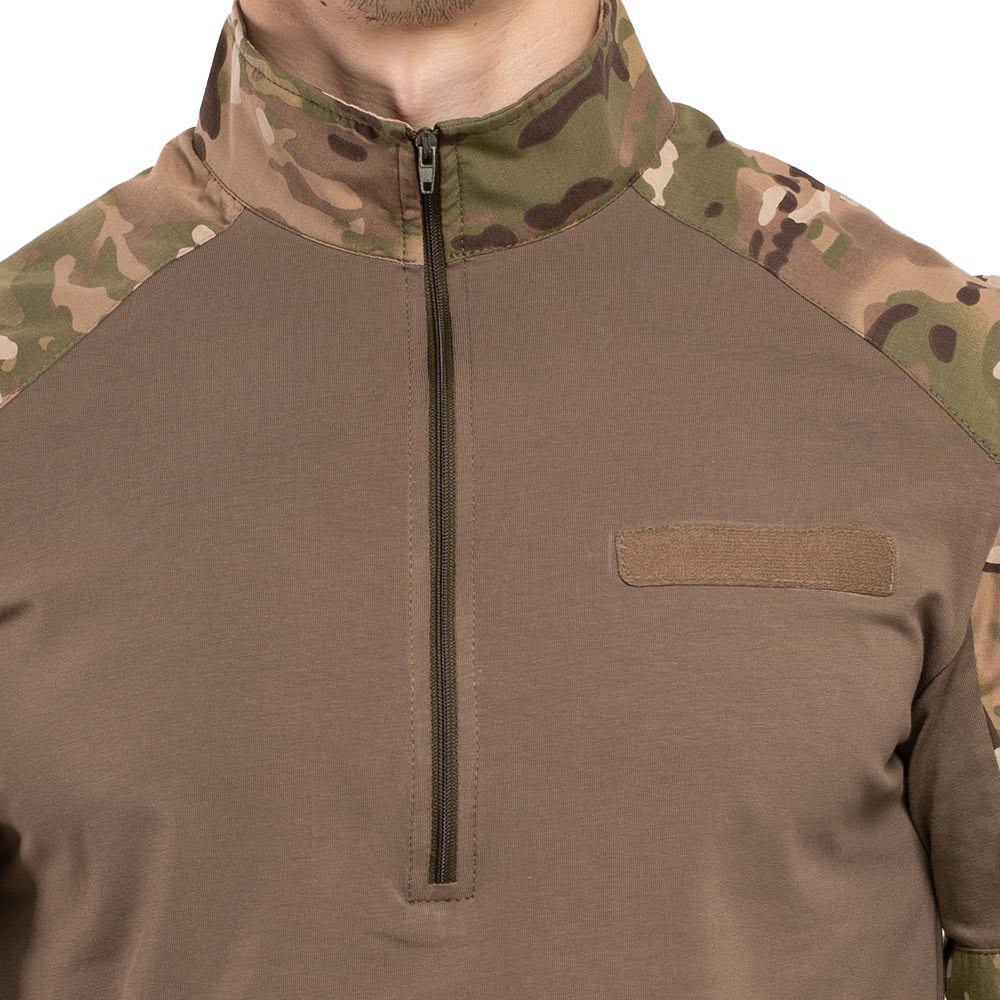Комір сорочки стійка, щоб шия не натиралася розвантажувальною системою або бронежилетом. Застібається сорочка на коротку блискавку під горло.