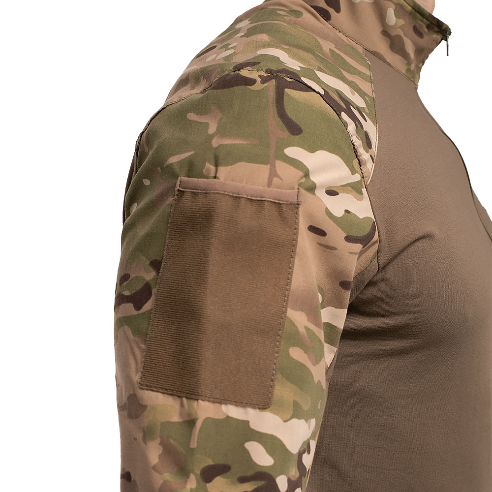Комір сорочки стійка, щоб шия не натиралася розвантажувальною системою або бронежилетом. Застібається сорочка на коротку блискавку під горло.