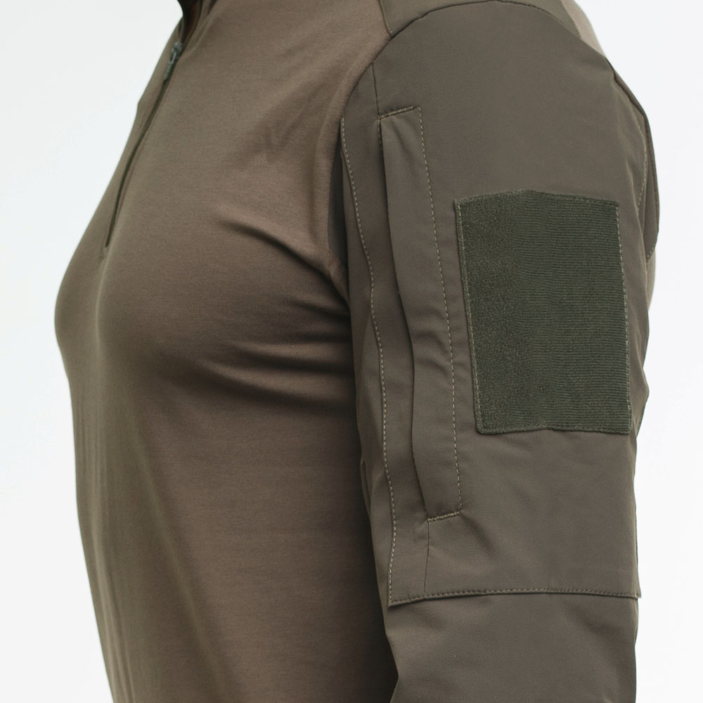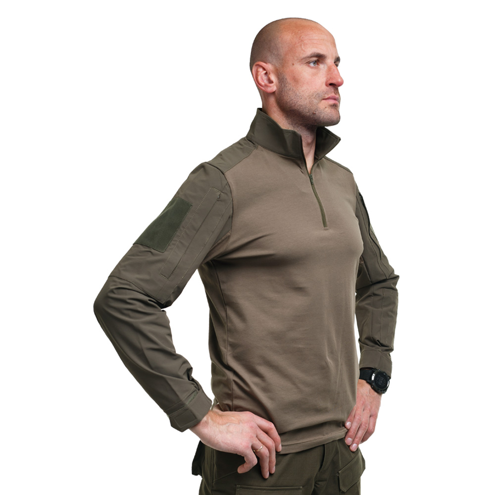 Комір сорочки стійка, щоб шия не натиралася розвантажувальною системою або бронежилетом. Застібається сорочка на коротку блискавку під горлянку.