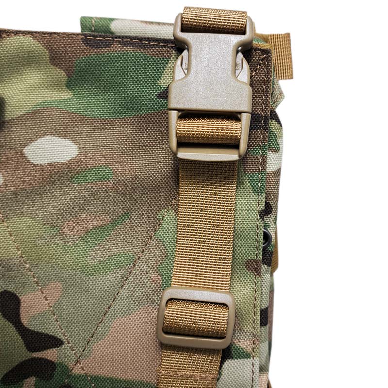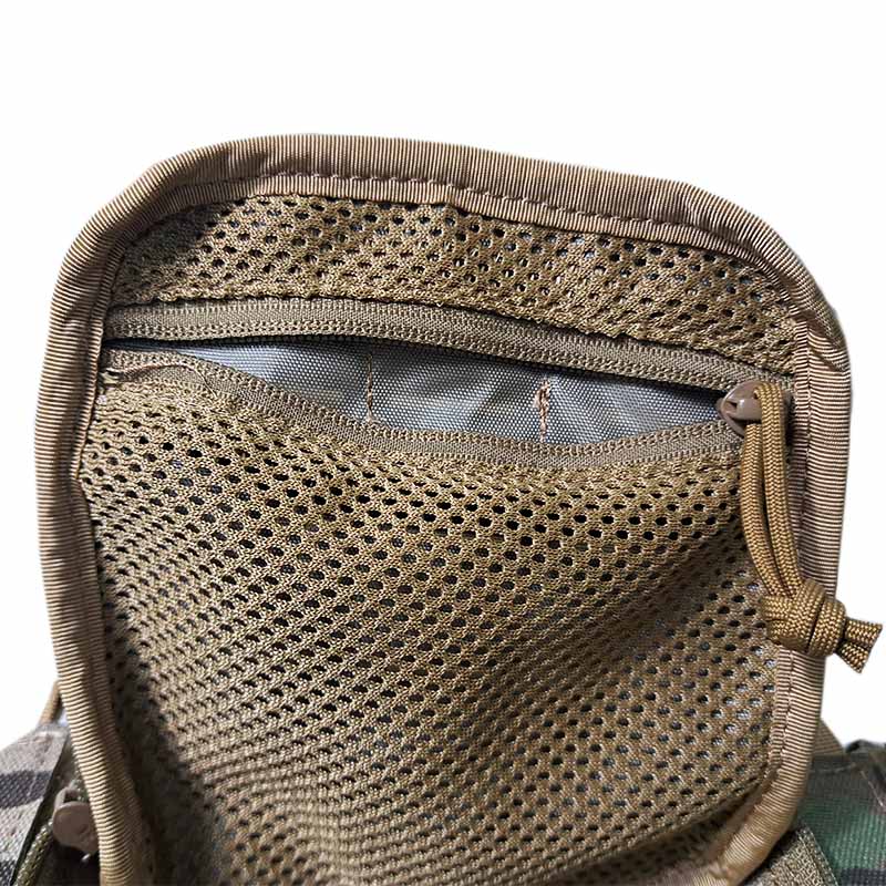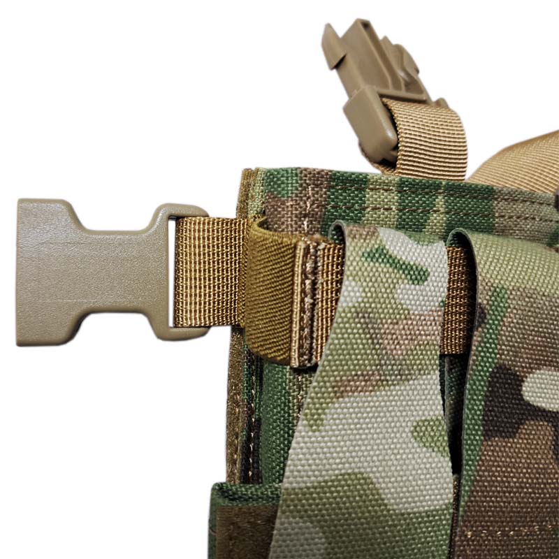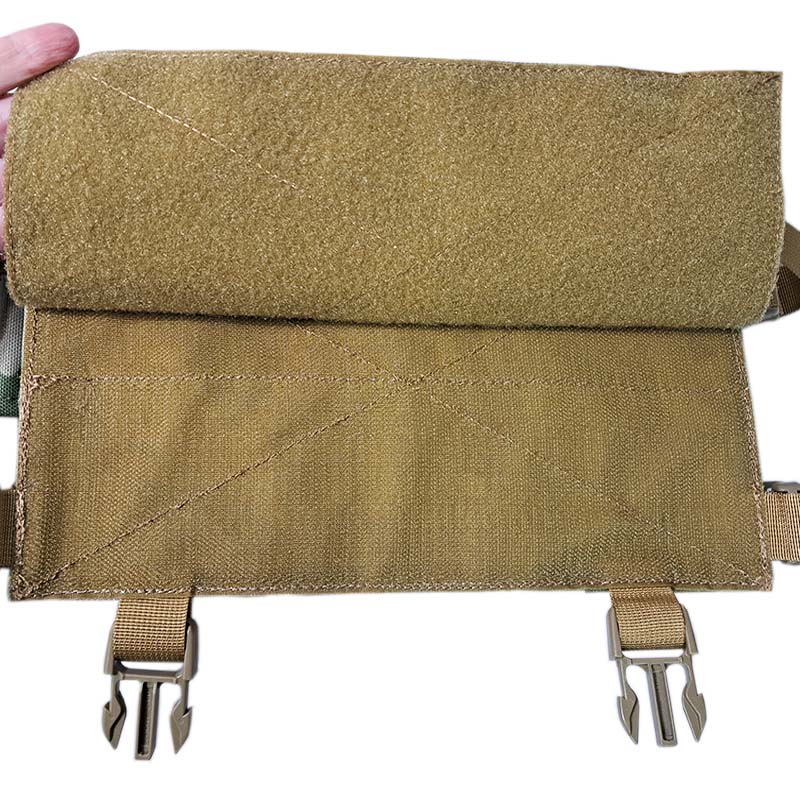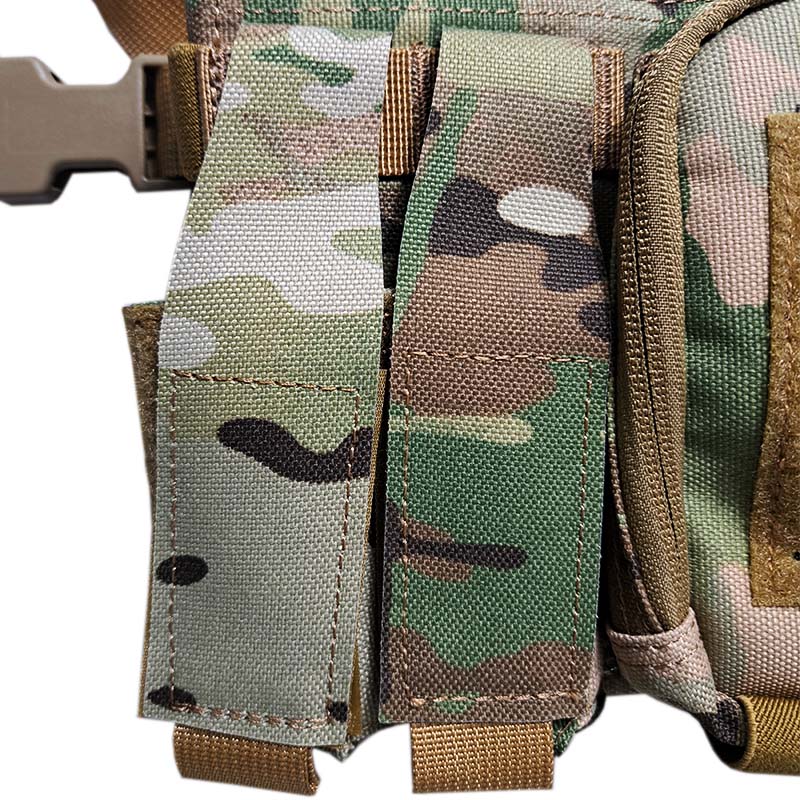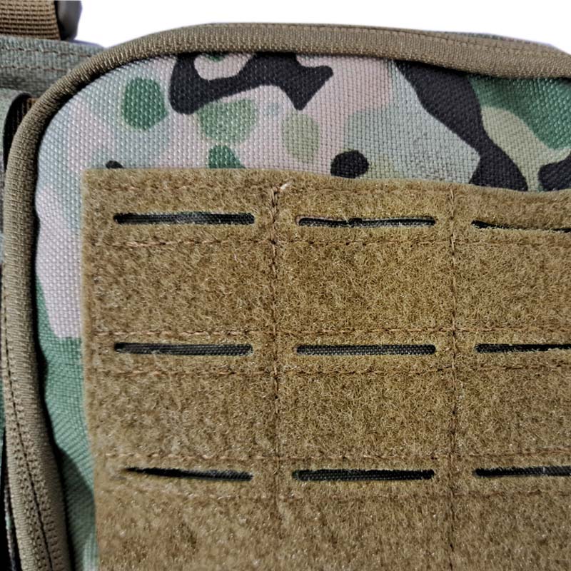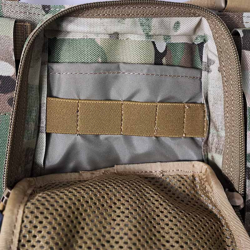 Нагрудник имеет 4 подсумка для винтовочных магазинов, 4 меньших подсумка для пистолетных магазинов, фонарика и т.д. Магазины прочно фиксируются в подсумках и не выпадут. Большая основная сумка с внутренним сетчатым карманом, удобными отделениями и сетчатыми эластичными лентами для упаковки тактического снаряжения. Система MOLLE Laser Cut с велкро-липучкой на большой сумке позволяет крепить дополнительное снаряжение и распознавательные знаки. Панель легко снимается и при необходимости может быть заменена на другую.