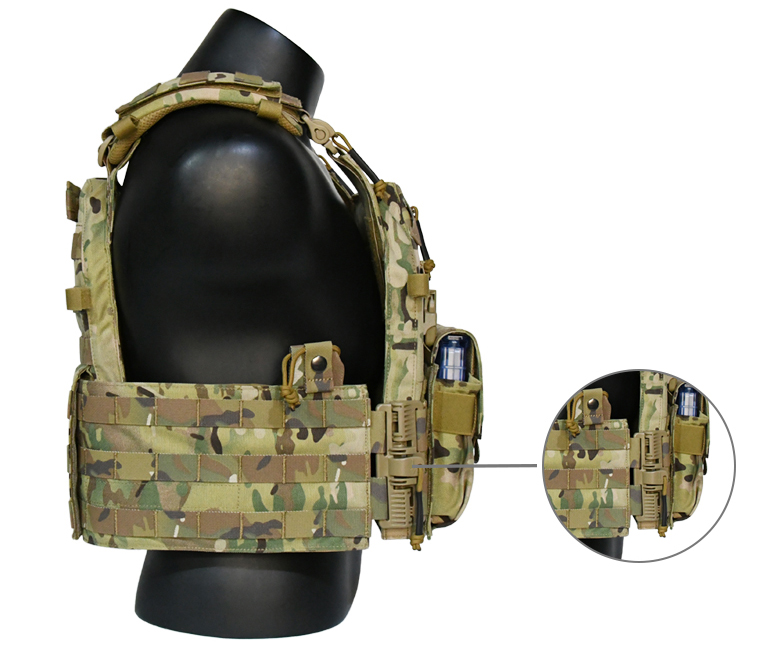 Плитоноска снабжена системой петель Molle для дополнительных подсумков. Модульная система клапанов на груди и спине позволяют быстро снять подсумки по ненадобности.
